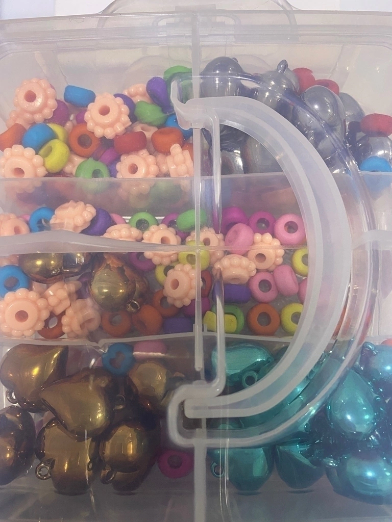 Viene con tanza y mostacillas de plástico, madera y vidrio. Con mil opciones para crear, tus propias joyas!